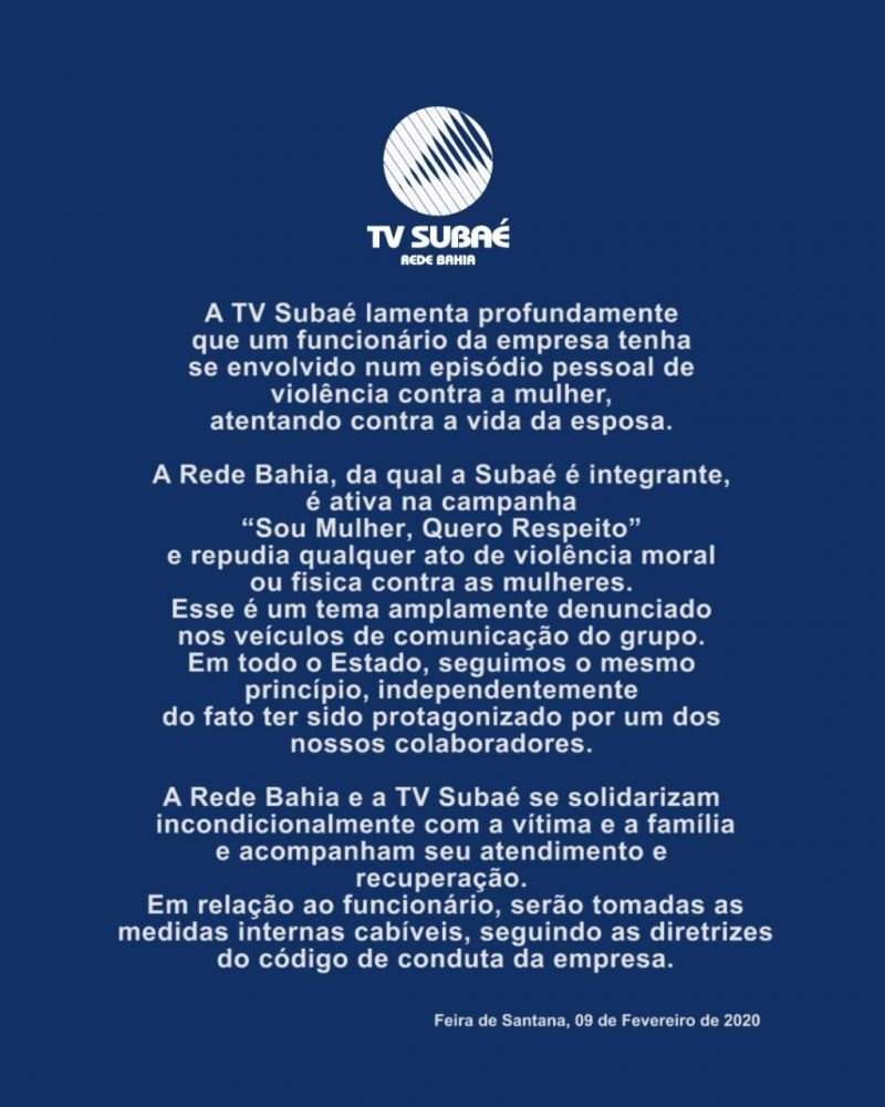 O acusado é funcionário da Tv Subaé, filiada da Rede Bahia no interior do estado. A emissora emitiu uma nota na tarde deste domingo (9) afirmando que "repudia qualquer ato de violência moral ou física contra as mulheres". Ainda segundo a nota, serão tomadas as medidas internas cabiveis, segundo as diretrizes do código de conduta da empresa. (Confira a nota na íntegra abaixo).