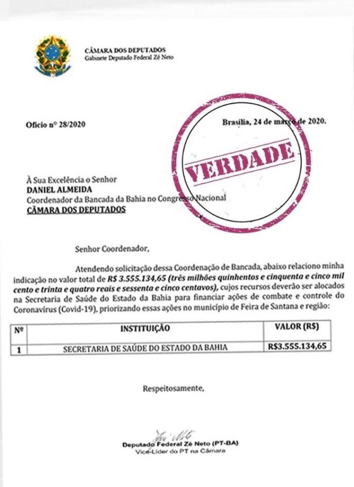 "Logo logo Feira de Santana receberá R$ 3,55 milhões de emendas nossas que serão usadas em Feira e Região a partir do aparato do Governo do Estado que logo logo vai trazer 40 leitos no Hospital Clériston 2, que terá sua inauguração antecipada para o final de maio para ajudar no combate do Coronavírus", disse o deputado em uma publicação em sua rede social.