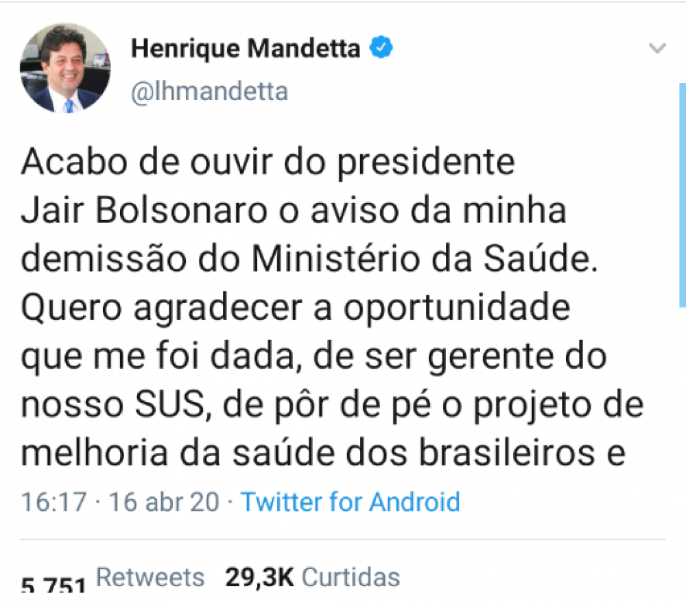 Médico ortopedista e deputado federal pelo DEM, Mandetta foi nomeado como ministro da Saúde logo após a posse de Bolsonaro e estava em rota de colisão com o chefe do Executivo nacional devido à maneira como conduziu a crise da pandemia do coronavírus.