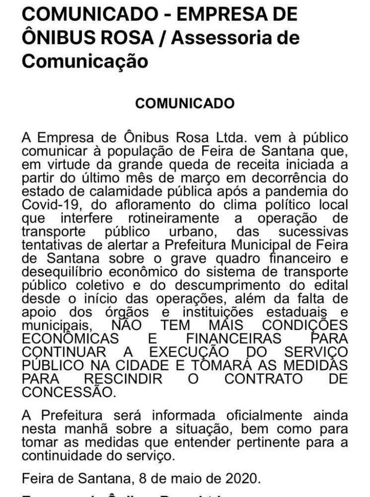 “A Empresa de Ônibus Rosa Ltda. vem à público comunicar à população de Feira de Santana que, em virtude da grande queda de receita iniciada a partir do último mês de março em decorrência do estado de calamidade pública após a pandemia do Covid-19, do afloramento do clima político local que interfere rotineiramente a operação de transporte público urbano, das sucessivas tentativas de alertar a Prefeitura Municipal de Feira de Santana sobre o grave quadro financeiro e desequilíbrio econômico do sistema de transporte público coletivo e do descumprimento do edital desde o início das operações, além da falta de apoio dos órgãos e instituições estaduais e municipais, NÃO TEM MAIS CONDIÇÕES ECONÔMICAS E FINANCEIRAS PARA CONTINUAR A EXECUÇÃO DO SERVIÇO PÚBLICO NA CIDADE E TOMARÁ AS MEDIDAS PARA RESCINDIR O CONTRATO DE CONCESSÃO", disse a nota.