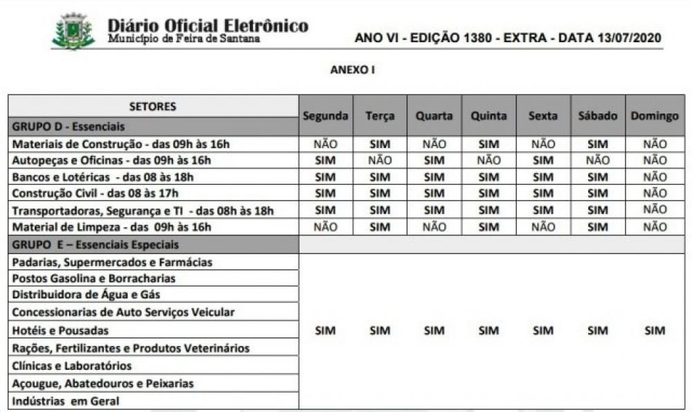 O comércio de Feira de Santana ficará fechado até o dia 20 de julho (segunda-feira), conforme o decreto de prorrogação publicado em edição extra no Diário Oficial do município, na manhã desta segunda-feira (13). Com isso podem funcionar apenas as atividades consideradas essenciais. Veja a tabela abaixo.